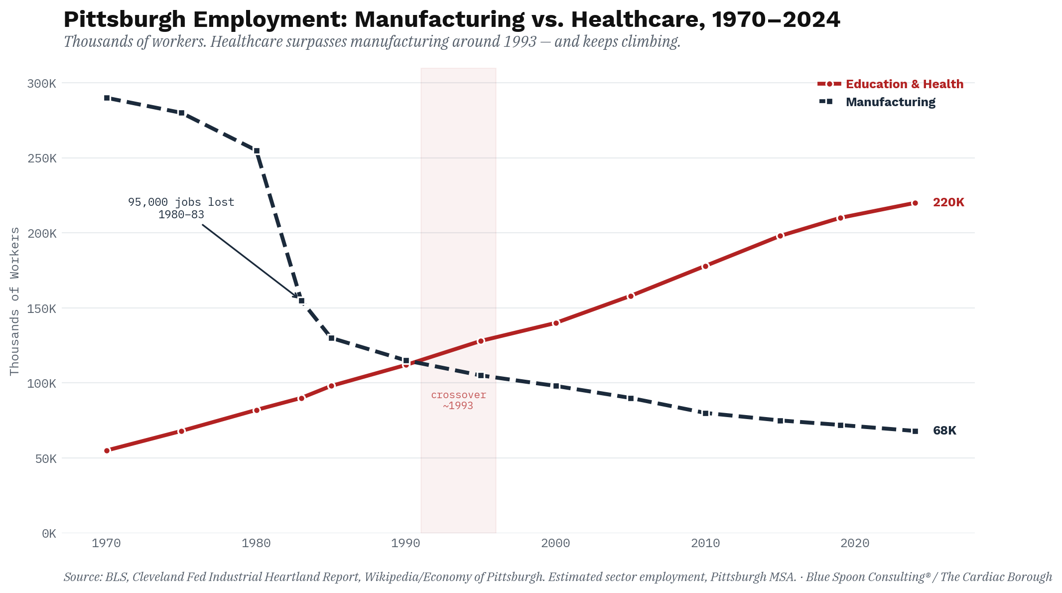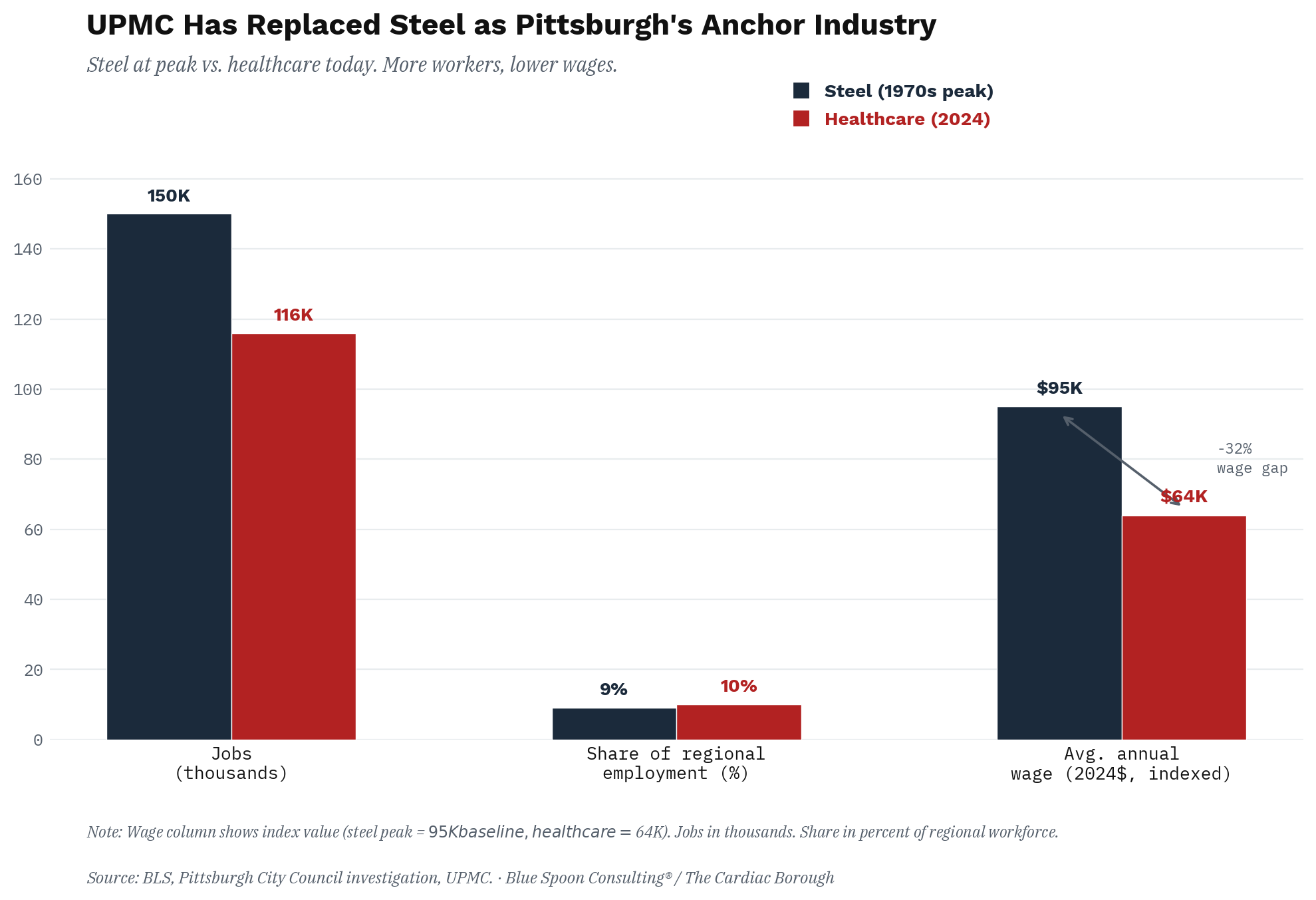 The average healthcare support worker in Pittsburgh earns $17.31 an hour. The average steelworker in 1973, at the moment of peak union power, was among the highest-paid industrial workers on the planet. By 1980, the average Pittsburgh production worker in manufacturing earned $360.89 weekly, roughly $70 above both the state and national average. The healthcare economy that replaced it did not replicate that premium. It could not, by structural logic, replicate it, because healthcare is labor-intensive in a way steel was not, which means the fundamental incentive of hospital administration has always been to hold wages down rather than share productivity gains with workers the way unionized industrial employers eventually did.